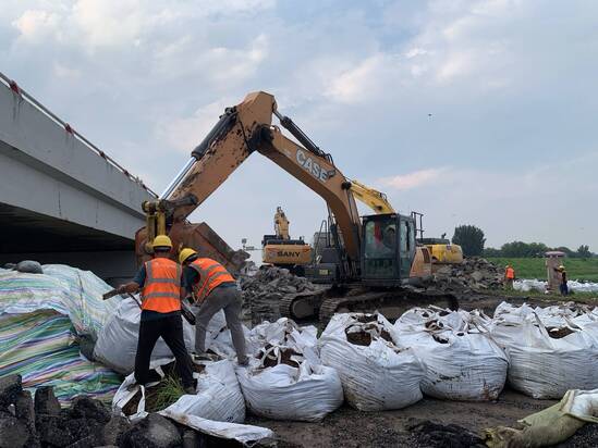 近日,北京市密云區西北部地區發生強降雨,最大降雨量超過300毫米。受強降雨影響,大清河水系上游水位持續上漲,防汛形勢嚴峻。 7月25日,電建生態公司大清河治理工程(廊坊段)施工項目總包部根據廊坊市水利局防汛指揮部指令,按照廊坊市洪水防御Ⅲ級應急響應工作要求,聞“汛”而動,第一時間組織搶險隊伍趕赴現場開展搶險工作,緊急向中亭河進行支援,對106國道、南張莊堤防薄弱點及存在坍塌風險的區域進行搶險加固。本次搶險,總包部累計投入挖掘機6臺、搶險人員26人,經過22小時晝夜連續奮戰,于26日上午8時許圓滿完成搶險任務,在洪峰來臨前提前完成堤防加固除險工作,為當地筑牢了防汛堤壩,以實際行動彰顯了央企擔當,收獲了地方政府、主管部門和當地群眾的廣泛贊譽。 搶險加固現場 |