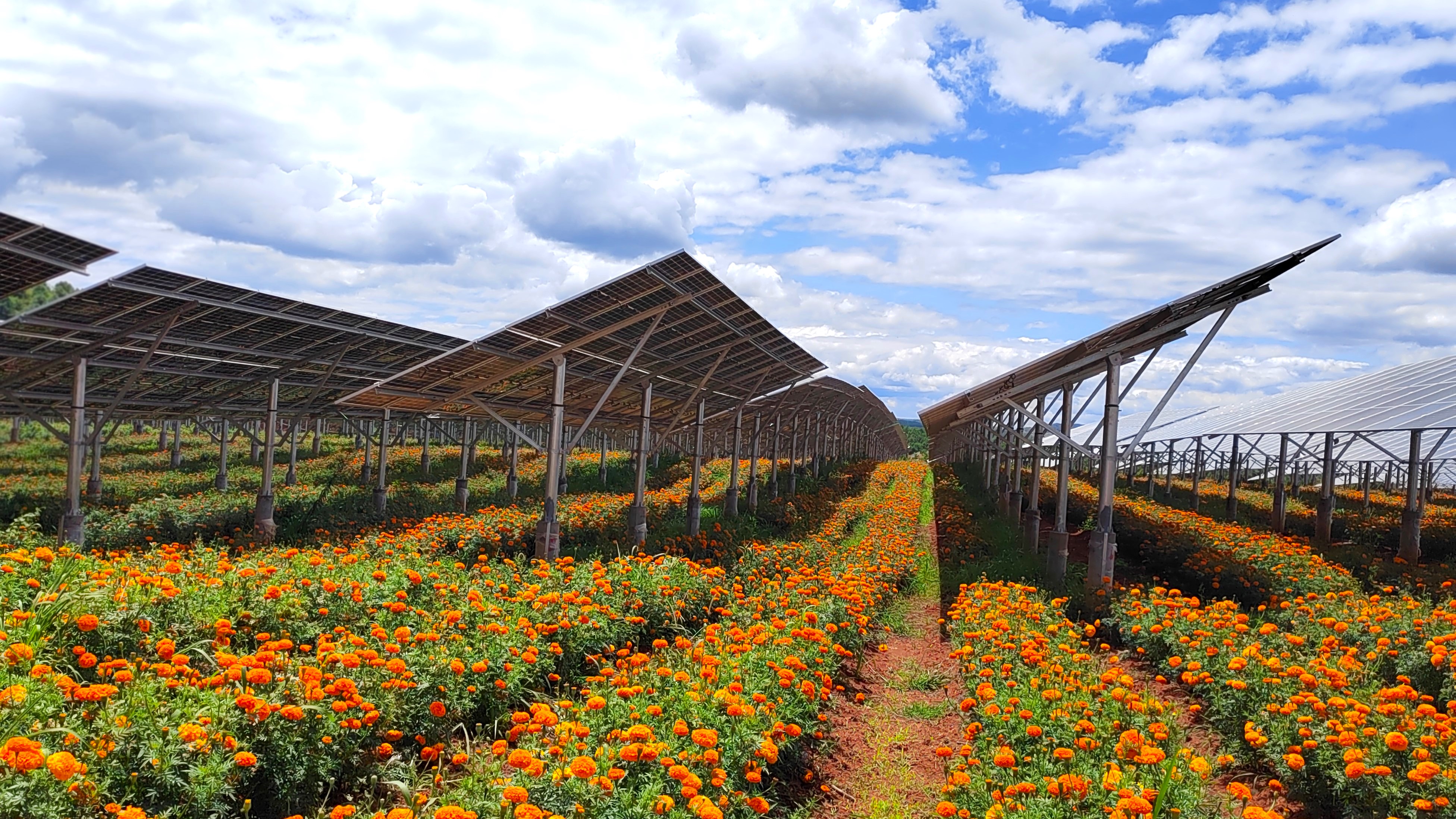 走近云南省曲靖市沾益區劉家莊的一處荒坡,排列整齊的光伏板與競相綻放的萬壽菊在陽光的照耀下格外璀璨奪目,當地依靠“光伏+特色產業”的方式,走出一條經濟發展與生態保護的“雙贏之路”。