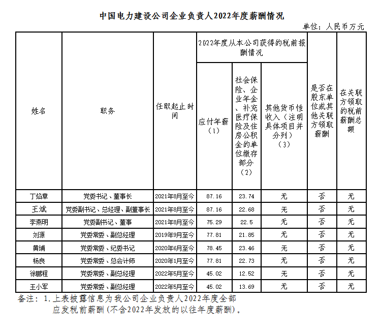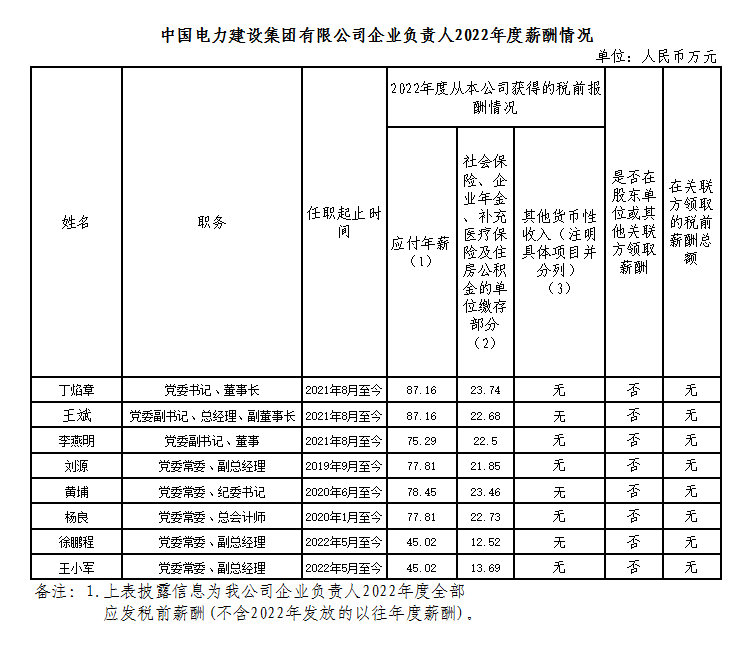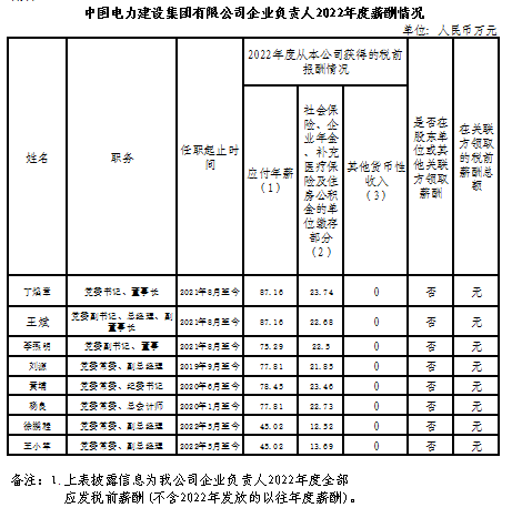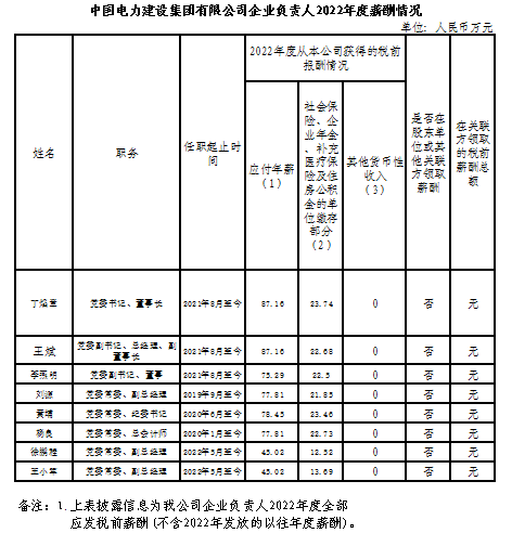 中國電力建設(shè)集團(tuán)有限公司企業(yè)負(fù)責(zé)人2022年度薪酬情況