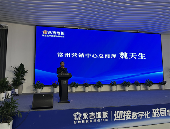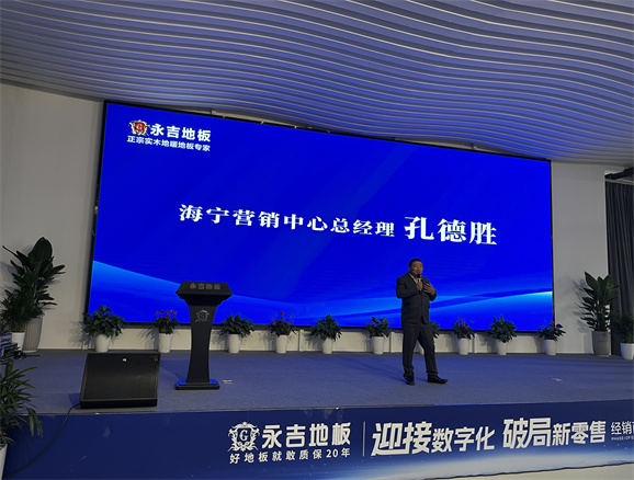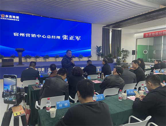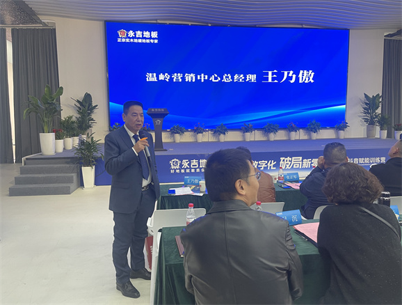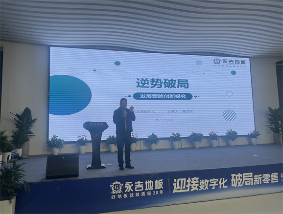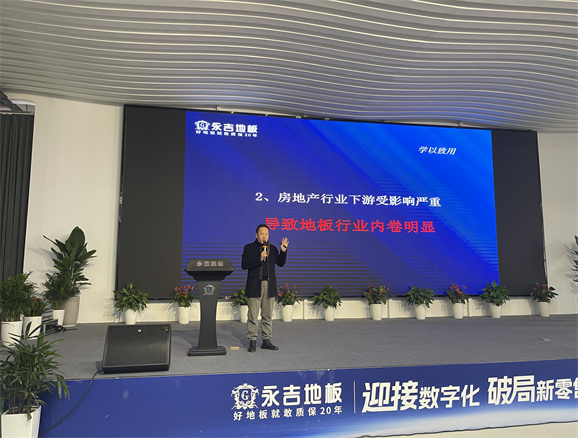 董事長助理胡俊青先生圍繞”實木地暖地板行業發展趨勢“主題,1、消費大環境分析,2、地板行業現狀 3、對于目前市場環境的現狀規劃:店面升級:以消費體驗為主 、 產品升級:聚焦實木 補充三層、 團隊打造:快速完善 1+2+1模式。